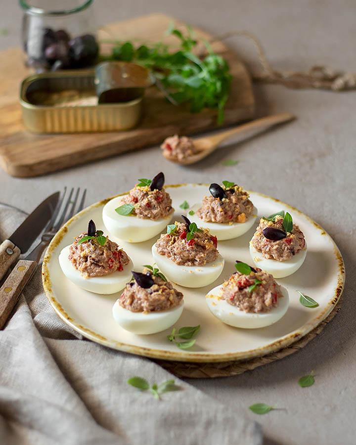 Como lo clásico es rellenarlos de atún he querido romper con la tradición y hacerlos con caballa que es un pescado más sabroso y lleno de propiedades. La caballa la encontraréis en el mismo formato que el atún en lata y a un precio muy similar. Ya tenemos el ingrediente principal del relleno, ya solo nos faltarían unos pimientos del piquillo, unas aceitunas negras, mayonesa, zumo de limón y las yemas de los huevos. Estos huevos se hacen como el resto de huevos rellenos: primero se cuecen los huevos, luego se mezclan los ingredientes del relleno y finalmente se rellenan los huevos. ¡Así de fácil!