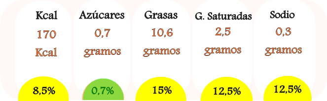El semáforo nutricional nos permite, gracias a tres colores NARANJA, AMARILLO Y VERDE saber si el producto que estamos consumiendo tiene una cantidad alta (naranja), media (amarilla) o baja (verde) en cuanto a Kcal, azúcares, grasas, grasas saturadas y sodio.