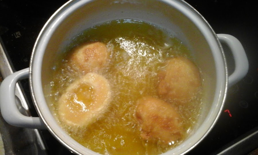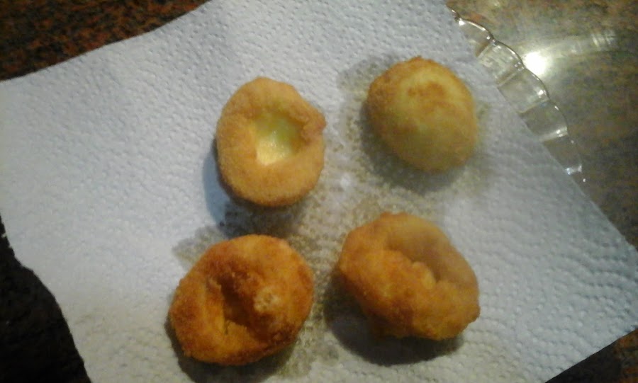 Lo primero que hacemos es poner a cocer los huevos, ya sabéis cuando el agua comience a hervir y los dejáis durante diez minutos. Los pasáis por agua fría y los peláis. Cortáis los huevos por la mitad, les quitáis la yema y comenzáis a rebozar la clara. Pasáis por harina, huevo batido y pan rallado y los ponéis a freír en abundante aceite. Cuando ya estén dorados los sacamos a un papel absorbente para quitarles el exceso de aceite.