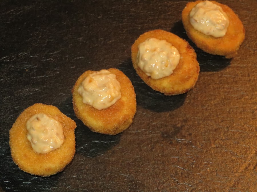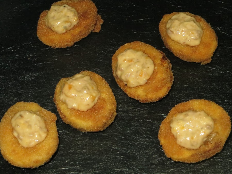 Ahora aplastáis las yemas, junto con el atún desmigado y la mayonesa y rellenáis los huevos, que previamente habéis rebozado. En la receta original los adornaban con alcaparras, como a mí no me gustan mucho, no les he puesto, pero le podéis colocar alcaparras, pimientos, aceitunas o aquello que queráis.