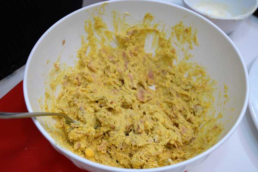 Paso 3 Deshacemos las yemas con un tenedor, desmigamos el atún y ponemos la mayonesa. Removemos bien hasta que quede una pasta con la que podamos rellenar los huevos.