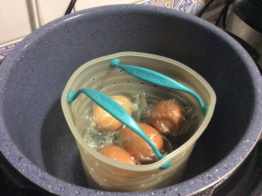 Envolvemos cada huevo en papel film (evitaremos que si tienen alguna pequeña grieta se salga la clara y la yema) y los colocamos sobre la rejilla de asados o en una vaporera dentro de la cubeta. Ponemos dos medidas de agua.