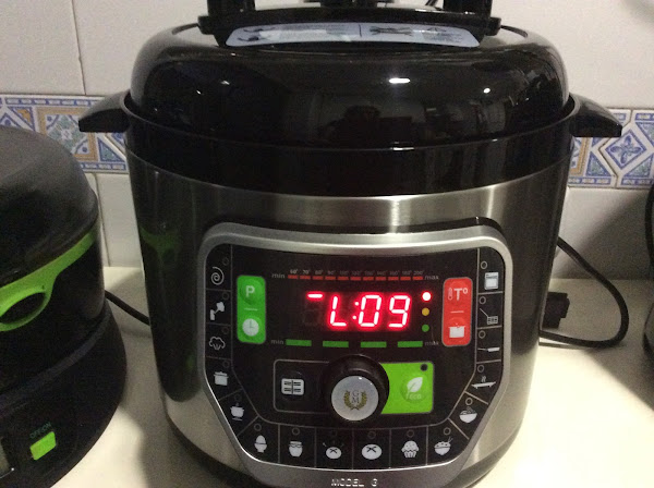 Programamos menú cocina presión alta 5 minutos (modelo D) menú turbo 3 minutos (modelos E, F y G). Cuando termine, cancelamos y dejamos que despresurice sola.
