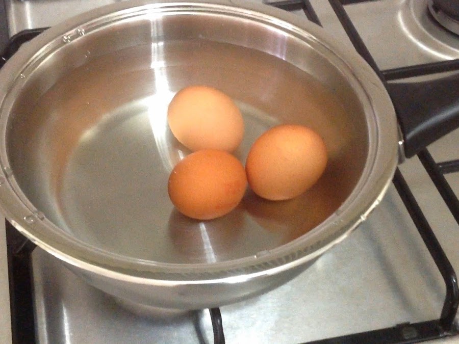 a) En nuestro cazo introducimos los 3 huevos, tapamos y programamos el "audiotherm" 12 minutos en función cocer "zananhoria", cuando la franja roja llegue a dicha función bajamos el fuego y esperamos que pasen los 12 minutos; apagamos y sacamos los huevos para enfriar.