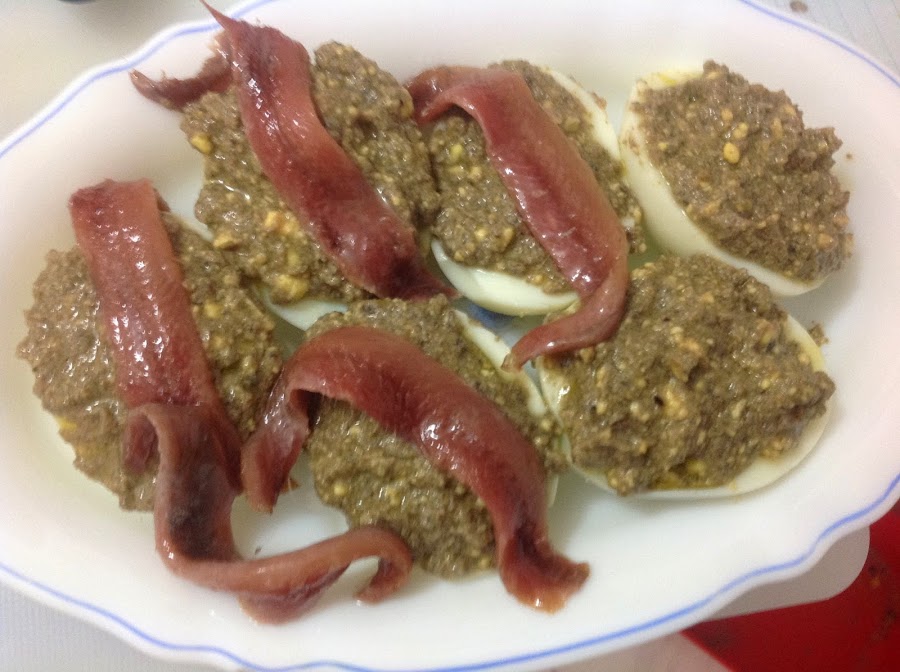 e) Solo nos queda homogeneizar todo muy bien y rellenar los huevos, a los que pondremos una anchoa en la parte superior para presentar el plato.