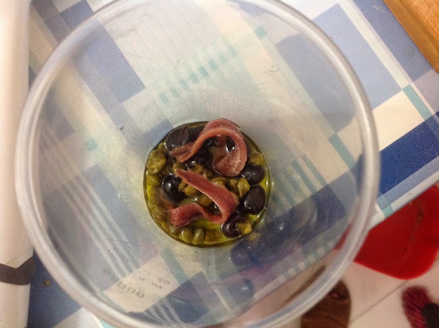 d) En un vaso de batidora ponemos las 10 aceitunas negras deshuesadas, 2 anchoas, 15 alcaparras (tápenas) y el aceite; lo batimos todo muy bien y aportamos al recipiente con las yemas para hacer la masa de relleno.