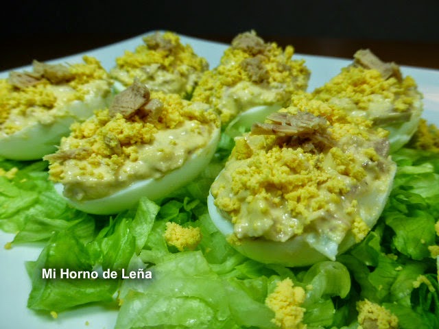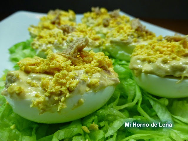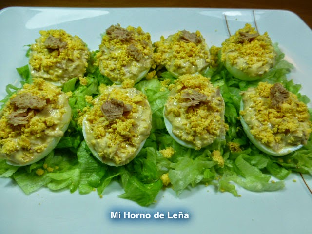 Ya está muy vista, la base de lechuga picada en el plato. Pero si a un plato le va bien es a este. Además de sujetar los huevos rellenos en su sitio, hacen de acompañamiento para el plato. Siempre está rica una lechuga fresquita con los restos de los huevos del plato, ya que aunque no quieras, siempre se cae algo sobre la lechuga.