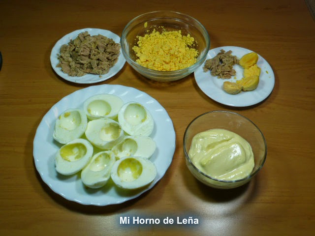 Ya fríos los huevos los cortamos por la mitad y apartamos la mitad de las yemas y un poco de atún para la decoración final.