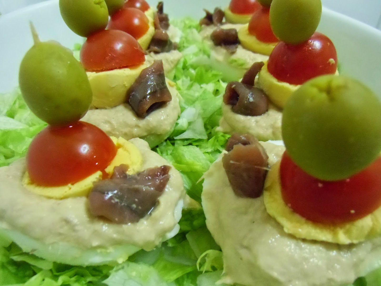Yo he puesto la media anchoa encima del huevo y en la banderilla medias yemas de otros huevos que cocí de más.