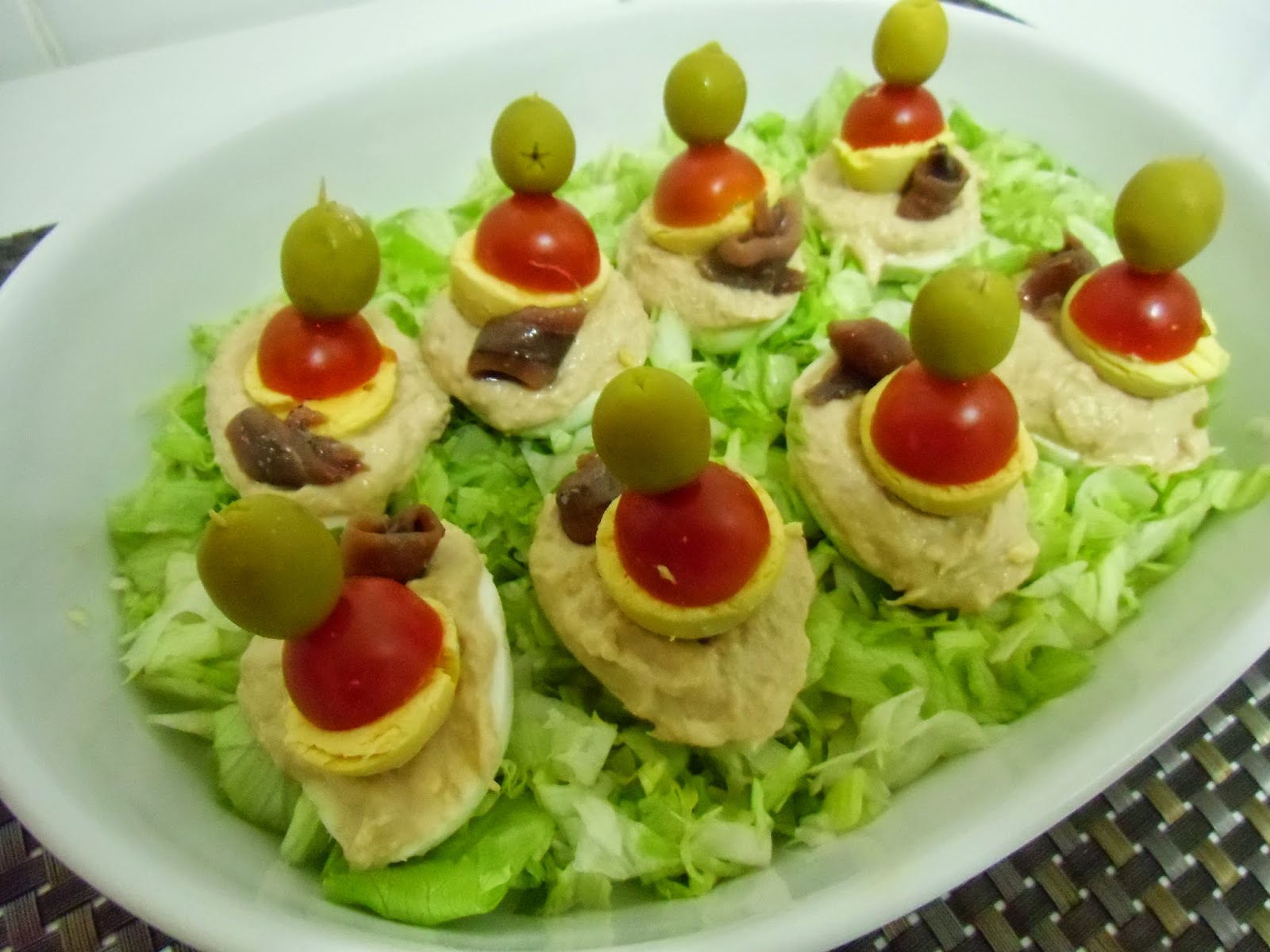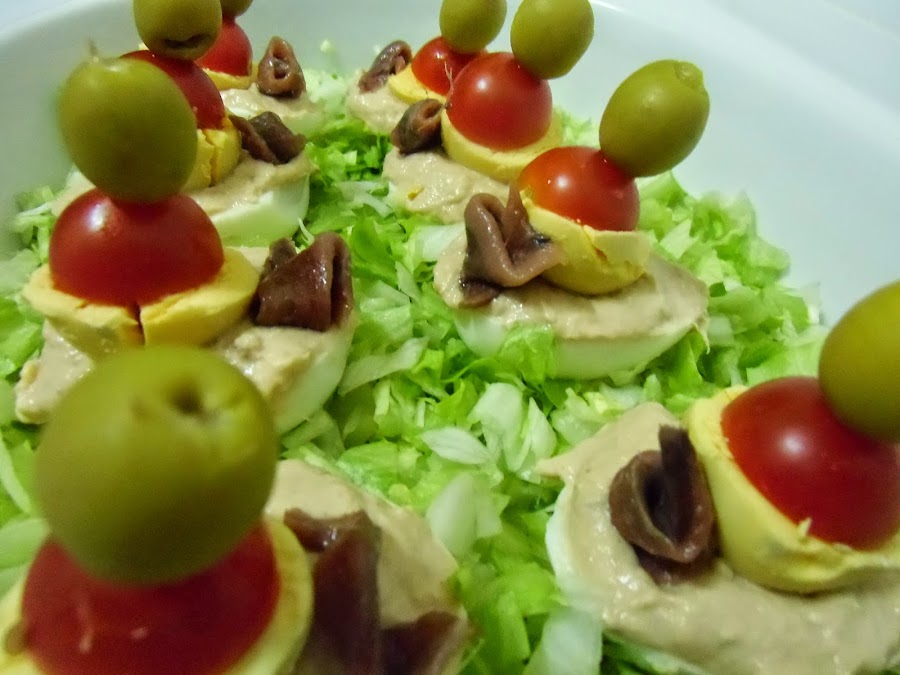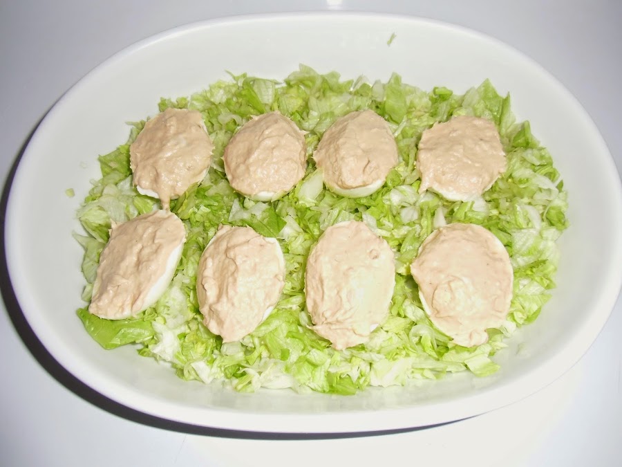 Ahora con esa pasta rellenamos las mitades de los huevos y los colocamos sobre una fuente con lechuga picada debajo.