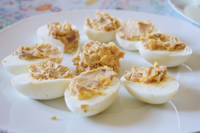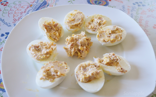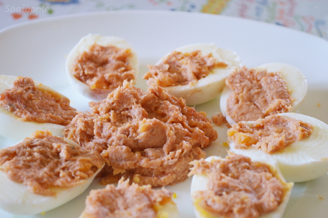 4. Con una cuchara sacamos la yema de cada huevo (y cada mitad) y las dejamos en el bol con el atún.
