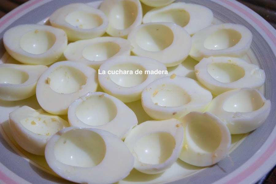 Cocemos los huevos, cuando empiece a hervir, los dejamos unos 10 minuto y retiramos...los dejamos enfriar y pelamos.Partimos por la mitad, separamos las yemas y reservamos