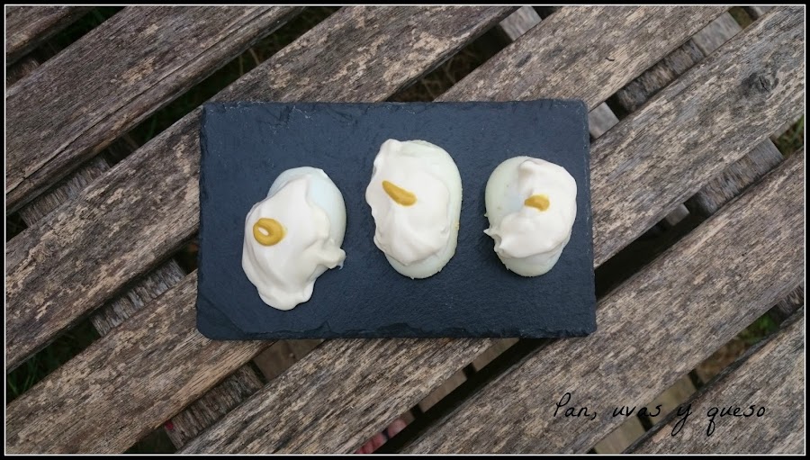 Rellenamosel hueco de las yemas con esta mezcla y los colocamos en un plato con la yema rellena hacia abajo.