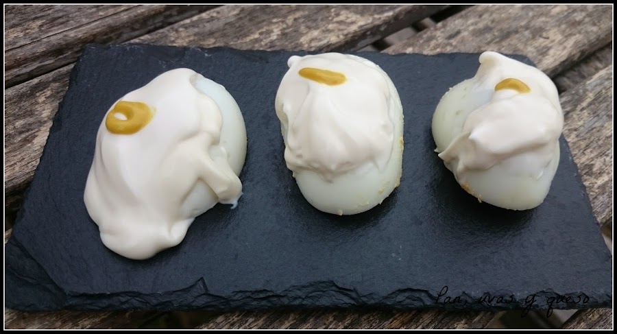 Cubrimos con unas cucharadas de salsa mayonesa y un poco de mostaza. Podemos utilizar las cuatro yemas restantes para decorar los huevos.