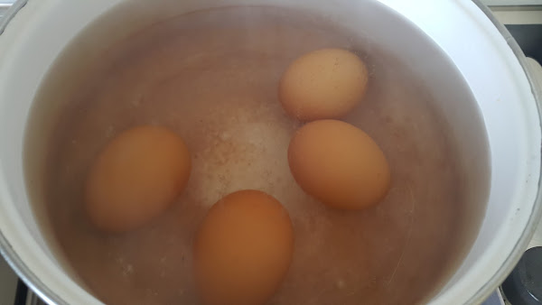 Lo primero que haremos será cocinar los huevos. Ponemos agua con sal al fuego y cuando rompa a hervir ponemos los huevos con cuidado de que no se rompan. Los dejamos a fuego medio durante 15 minutos.
