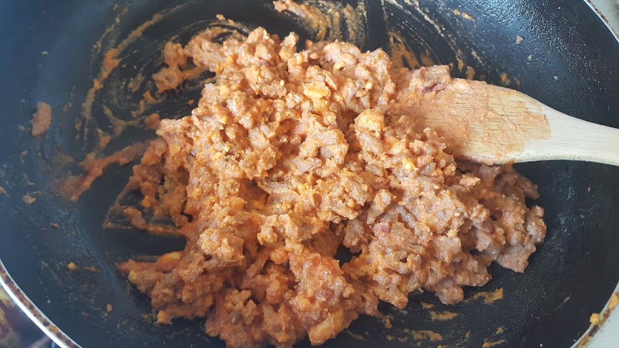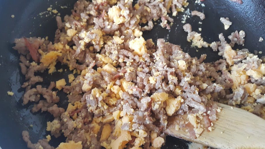 En la sartén del relleno añadimos la carne picada y la yema de los huevos.