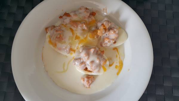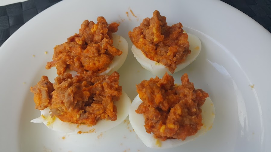 Una vez tengamos los huevos cocidos los enfriamos en agua fría y los pelamos con delicadeza. Seguidamente los cortamos por la mitad y los vaciamos.