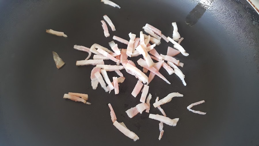 Mientras preparamos el relleno. Cortamos el bacon a tiras y lo doramos en una sartén sin aceite.