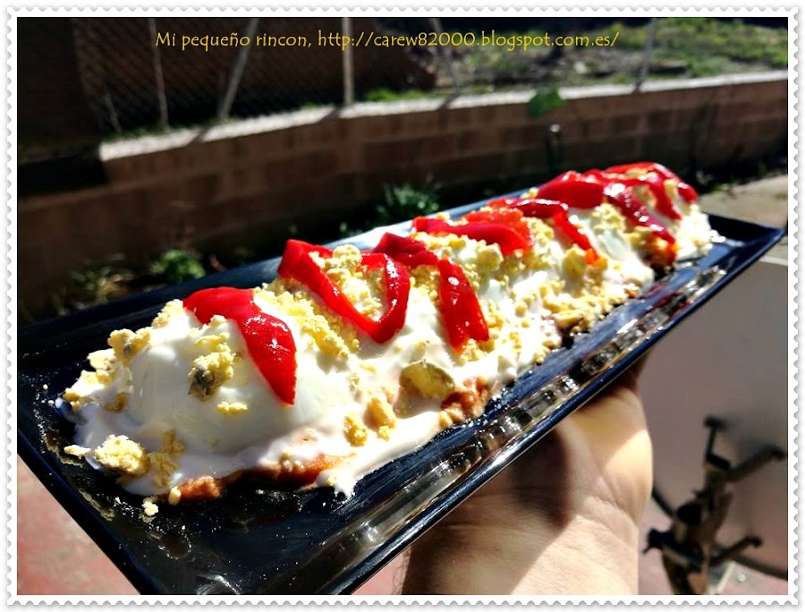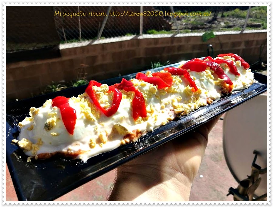 Vamos rellenando las mitades de los huevos de uno en uno y colocamos en una bandeja o plato y echamos la mayonesa por encima y extendemos por todos los huevos, añadimos la ralladura sobrante de las yemas por encima y el pimiento previamente cortado en tiras nos servirá para decorar el plato….