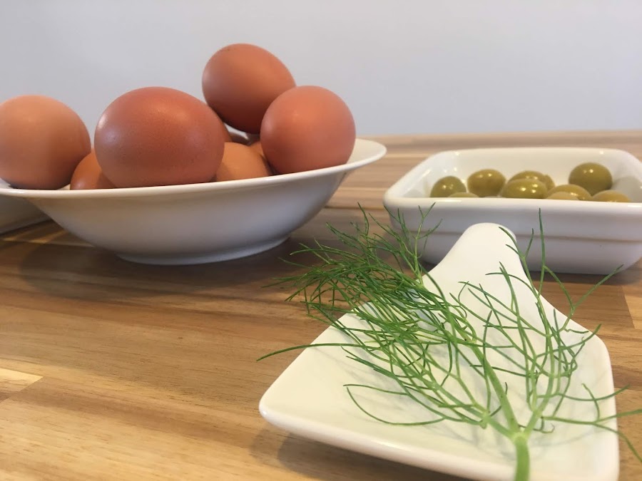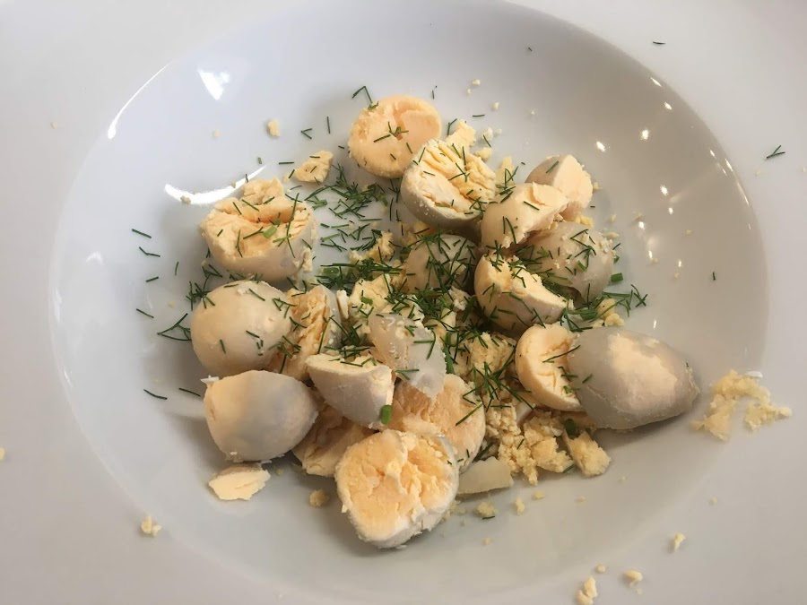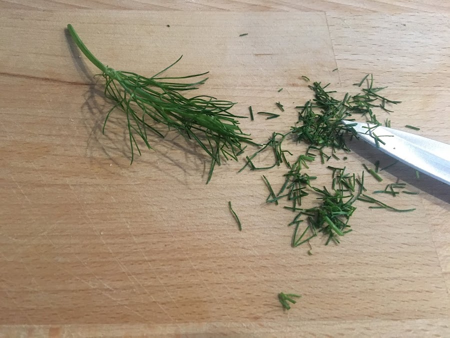 En primer lugar picaremos la ramita de eneldo fresco y la añadiremos al plato donde hemos ido reservando las yemas.