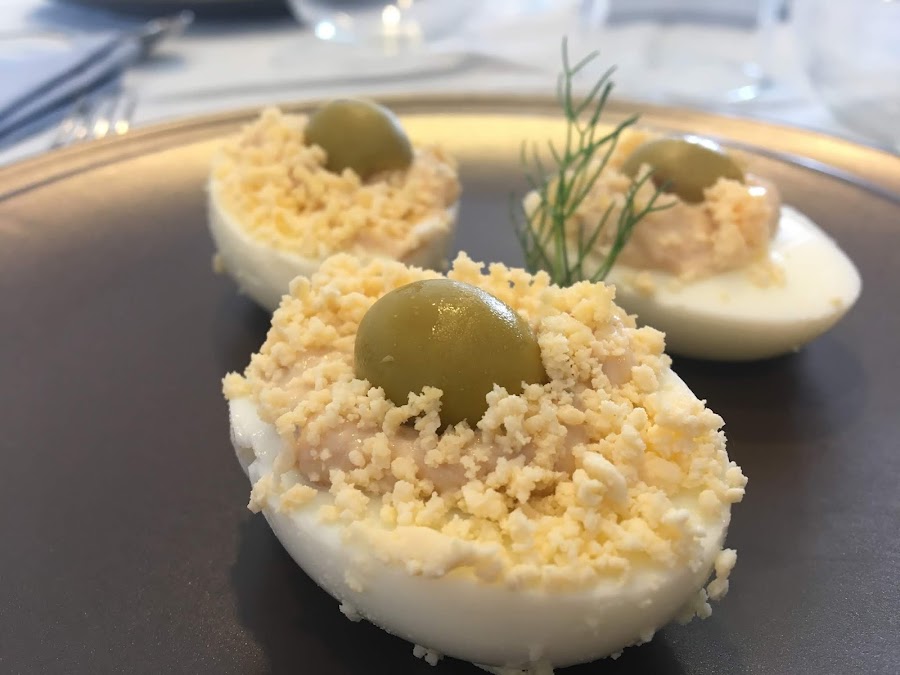 Ahora ya solamente deberemos servir la fuente y que cada cual pueda coger de ella los huevos rellenos que desee o los podemos colocar en un plato individual para llevarlos a la mesa.