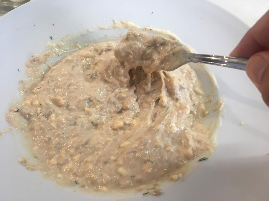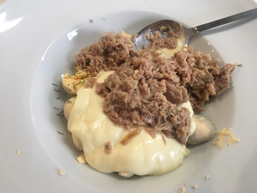 Seguidamente le añadiremos el atún, la mayonesa, un poquito de sal y una pizca de pimienta negra molida y chafando las yemas lo mezclaremos todo hasta conseguir una masa uniforme.