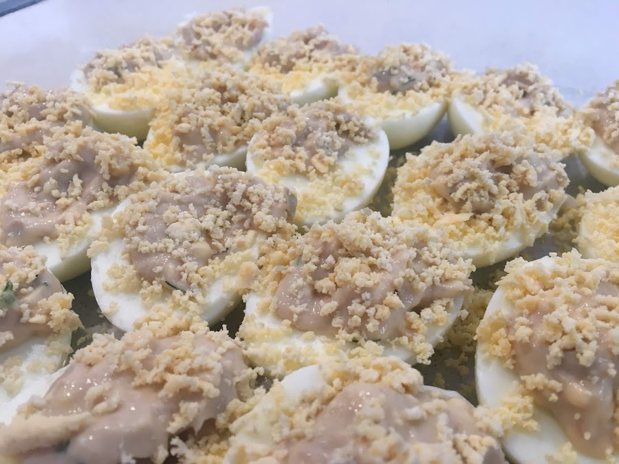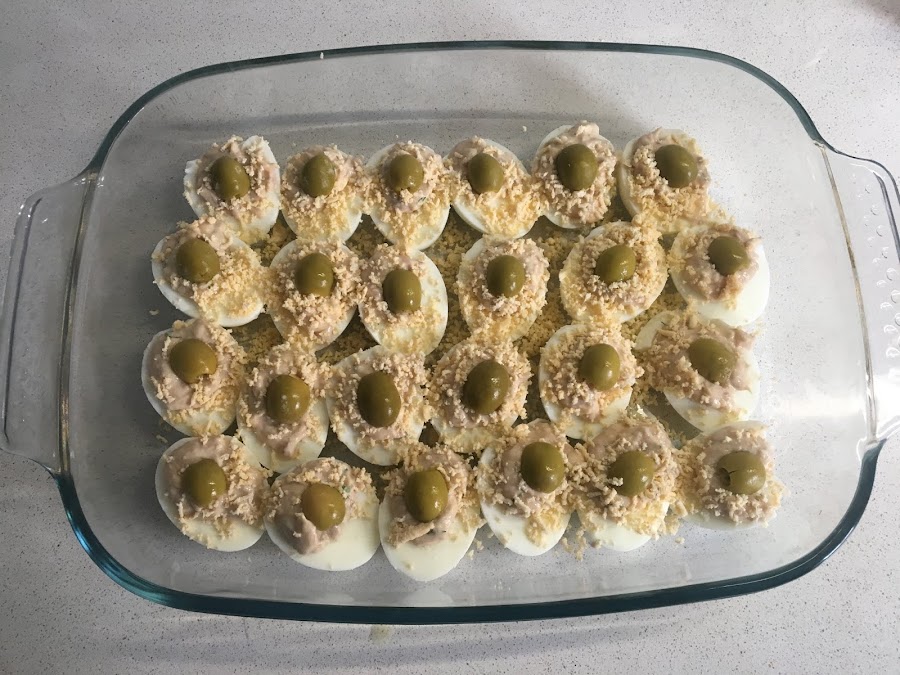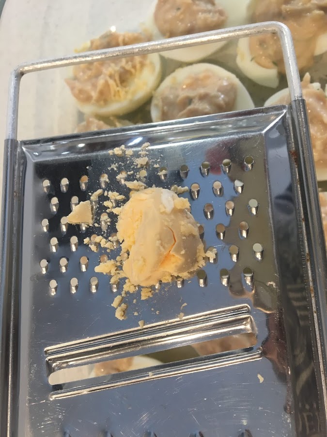 Una vez tenemos todos los huevos rellenos podemos coger la yema que hemos reservado y la podemos rallar encima.