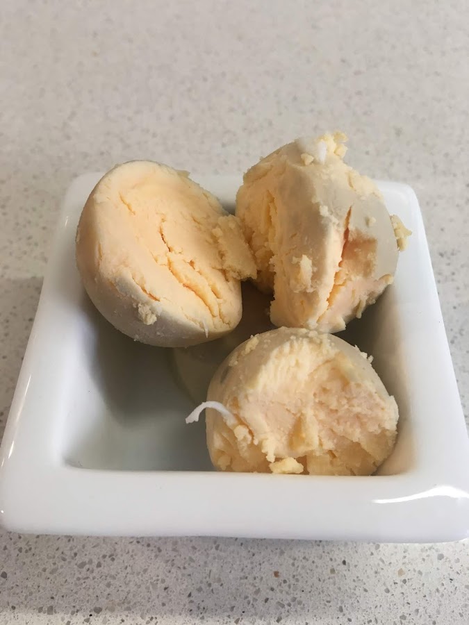 Cuando tenemos los huevos sin piel los partiremos de la mitad y separaremos las yemas y las claras.