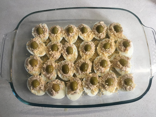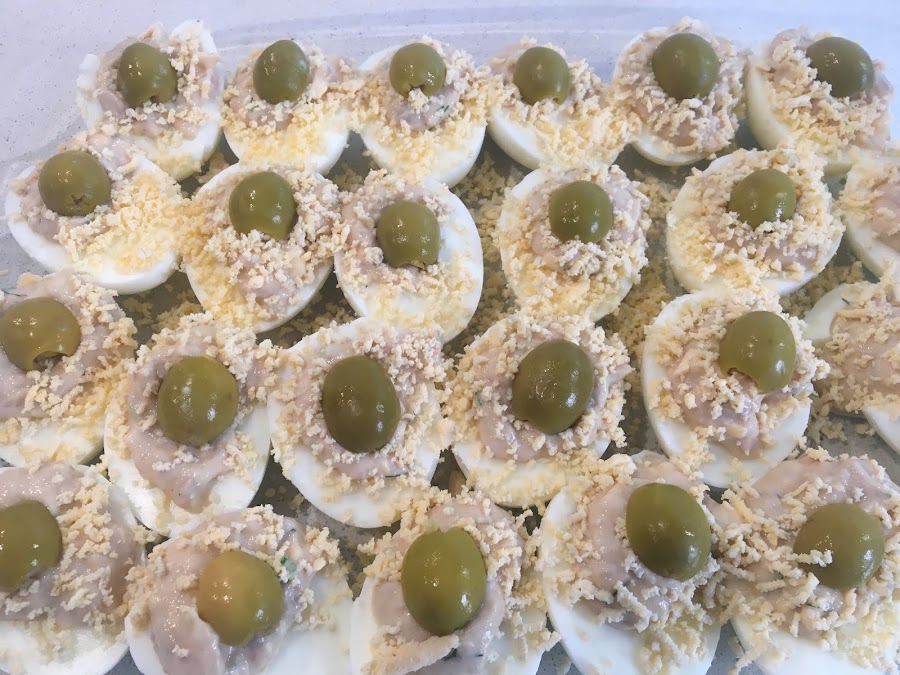 Luego podremos partir por la mitad las aceitunas con anchoa y colocar encima de cada huevo relleno una mitad de aceituna o podeis poner una aceituna entera encima de cada uno.
