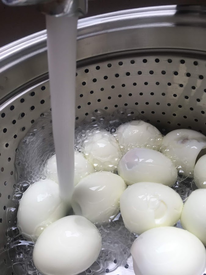 Cuando ha transcurrido el tiempo previsto para hervir los huevos los retiramos del fuego, en un escurridor retiramos el agua y los vamos pelando uno a uno.