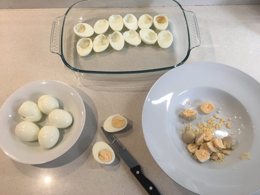 Iremos retirando las yemas en un plato y las medias claras las podremos ir colocando en una fuente.