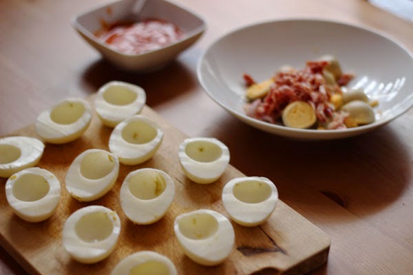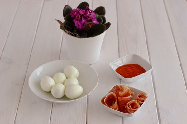 1. Cocer los huevos, abrirlos por la mitad y reservar las yemas en un bol. Hacemos una pasta con las yemas, el jamón serrano picadito y el tomate.