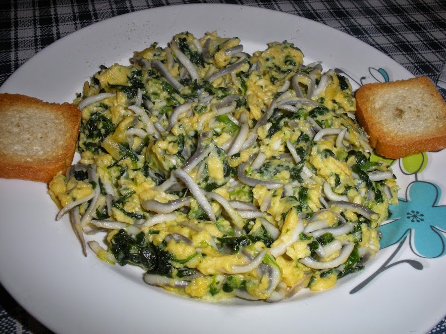 Ponemos en una sarten un chorro de aceite de oliva, una vez caliente le añadimos los huevos con las angulas sucedáneas y las espinacas y un buen chorro de leche evaporada.