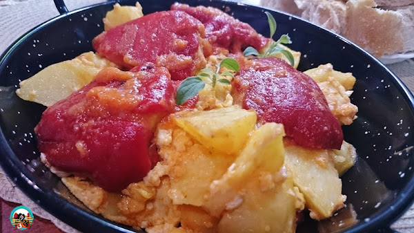 Huevos rotos con pimientos...ingredientes: