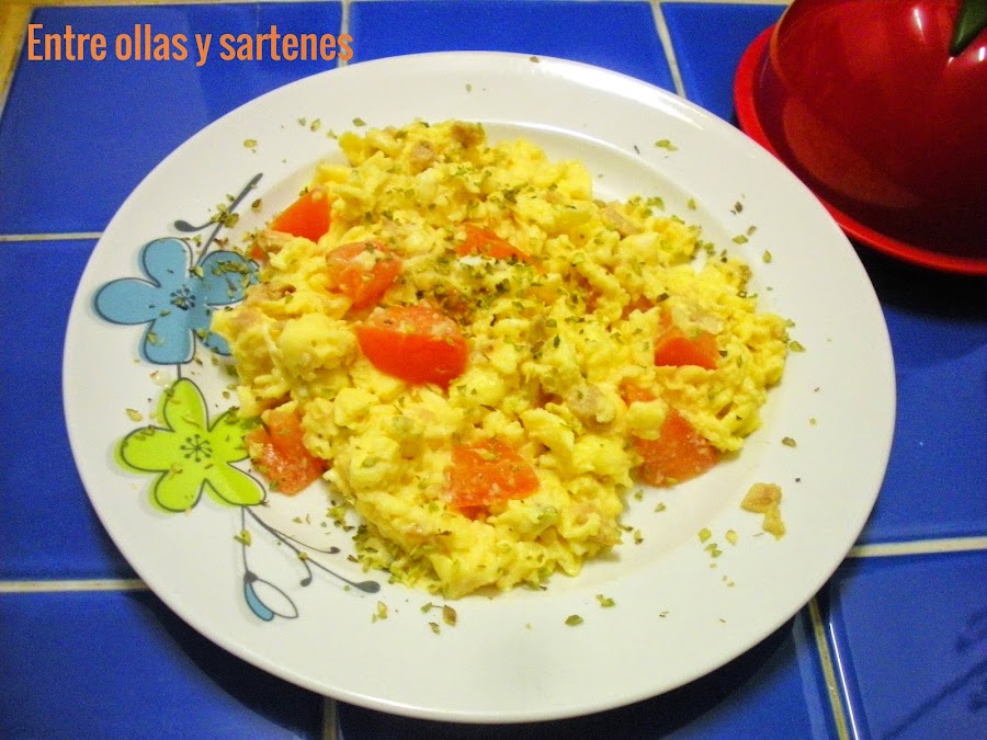Mezclamos los huevos con el tomate y el atún y lo vertemos en la sarten, añadimos un chorro de leche evaporada y cuajamos sin dejar de mover.