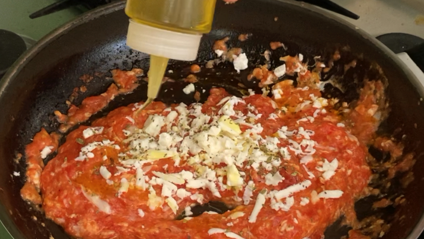Añade un poquito de sal (cuidado, el queso feta también lleva sal), azúcar y pimienta molida a tu gusto.