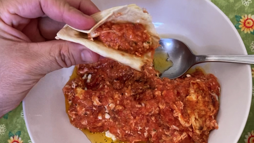 Acompaña de pan de pita (de un buen pan de hogaza o de una tortilla de trigo).
