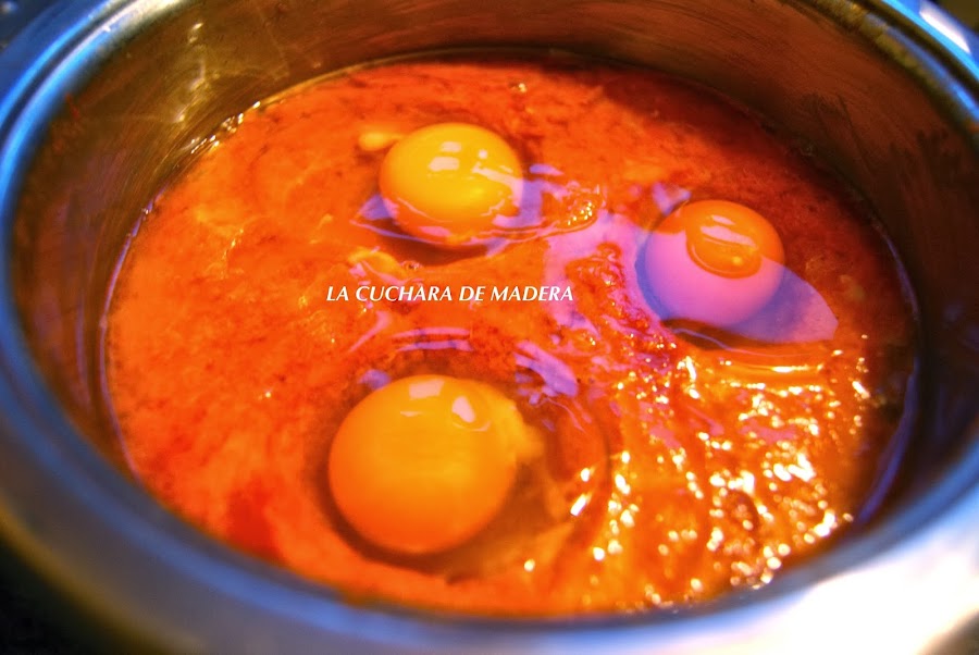 Retiramos el ajo de la salsa, batimos 2 huevos y los agregamos a la salsa de tomate dejando ahora a fuego bajo para que cuaje, removiendo para que no se pegue