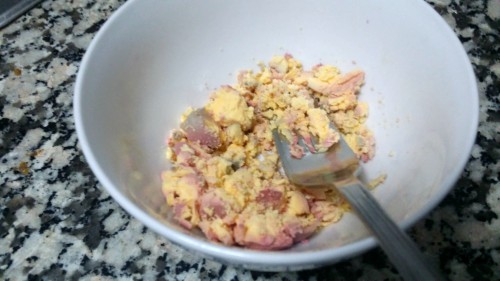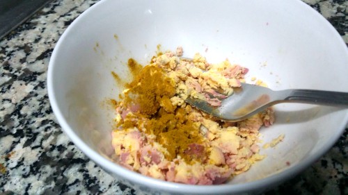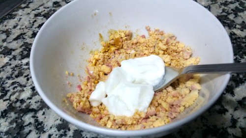 - Poner las yemas en un cuenco con el queso batido y el curry y mezclarlas con un tenedor haciendo una pasta.