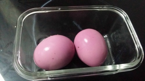 - Guardar en la nevera. Cuanto más tiempo más rosas quedaran. Yo los dejé dos horas en dos huevos y toda la noche en otro huevo.