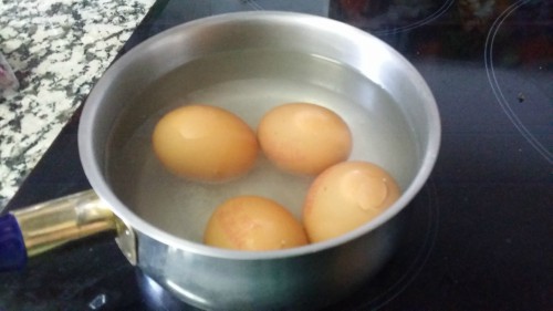 - Hervir los huevos en agua con sal y un chorrito de vinagre durante 10 minutos.