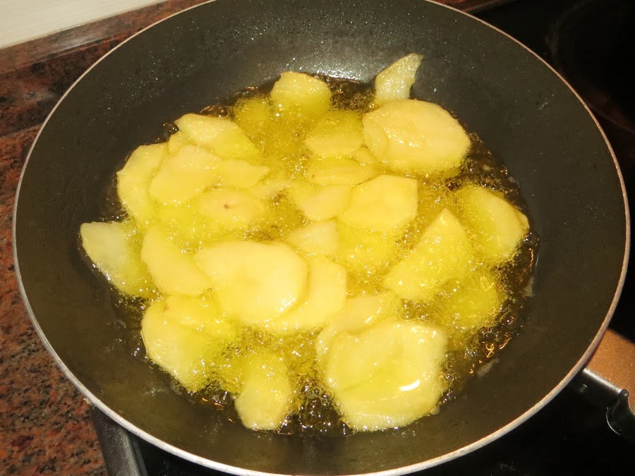 Lo primero que hacemos el lavar y pelar las patatas como más nos guste, lo podemos hacer a tiras o en rodajas como hago yo. Ponemos aceite de oliva en la sartén y cuando esté bien caliente añadimos las patatas, que habremos salado con anterioridad, las freímos a fuego medio y cuando estén cocinadas subimos el fuego un poco para que se queden doradas por fuera.