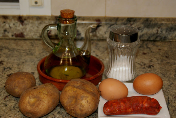 Corta el chorizo a rodajas y pásalo por la sartén con un poco de aceite, muy poco porque va a soltar su propia grasa. Cuando cambie de color, apártalo del fuego o se te secaría demasiado.