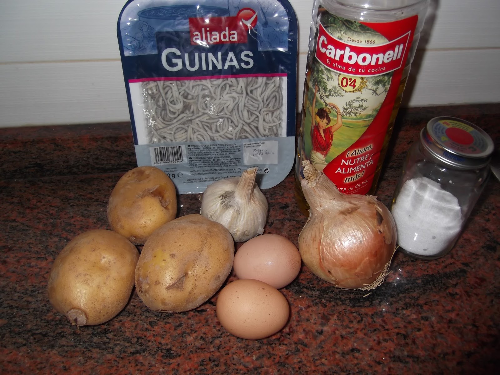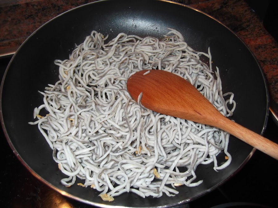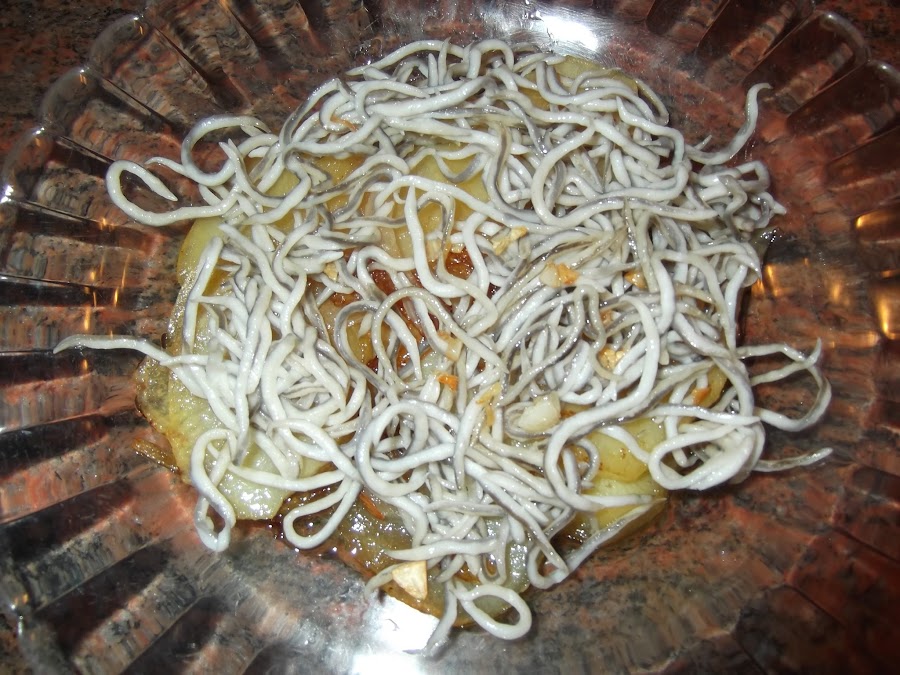 Pasados unos 25 minutos, cuando veáis que las patatas están bien cocinadas, apagáis el fuego y escurrís bien las patatas y las colocáis en un plato, daros cuenta que si no escurrís las patatas se os puede quedar el plato demasiado aceitoso. Por supuesto, el aceite que habéis empleado para las patatas no lo tiréis ya que os puede servir para multitud de platos. El siguiente paso es pelar y cortar los ajos en trozos muy pequeños, en otra sartén los ponéis a dorar con un poco de aceite, cuando veáis que ya están dorados añadís la angulas sucedáneas y lo rehogáis todo durante un par de minutos.