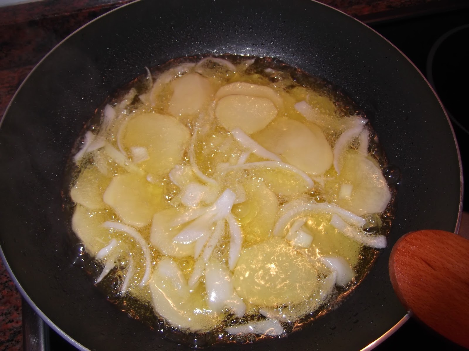 Lo primero que hacemos es pelar las patatas, ya que va a ser lo que más se tarde en cocinar. Las pelamos tipo panadera para que el plato os quede más vistoso. Ahora echamos un gran chorro de aceite en la sartén y cuando veamos que está caliente comenzamos a freír las patatas, que estarán ya saladas. Mientras tanto vamos cortando la cebolla en juliana y cuando la tengamos la añadimos a la sartén para que se empiece a pocharse con las patatas.