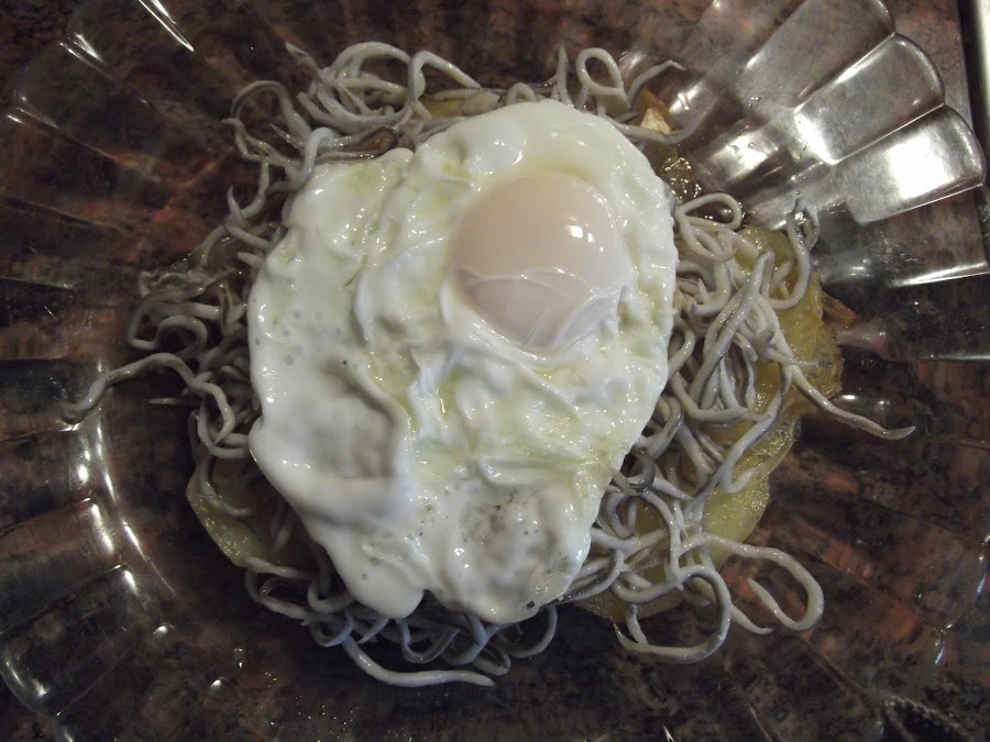 Lo último que tenéis que cocinar son los huevos, se supone que los huevos los ponéis a hacer en una sartén y cuando estén casi fritos le añadís las patatas y la cebolla y de ahí el nombre de huevos rotos, pero a mí personalmente me gusta más freírlos en la sartén y añadírselos al plato, eso sí que no os queden muy pasado, si no con suficiente yema para luego poder romperlos en el plato. Ahora ya sólo queda montar el plato, ponéis una base de patata con cebolla, luego las angulas sucedáneas y por último los huevos rotos, los rompéis justo antes de comer y revolvéis todo, ya veréis que bocado más exquisito.