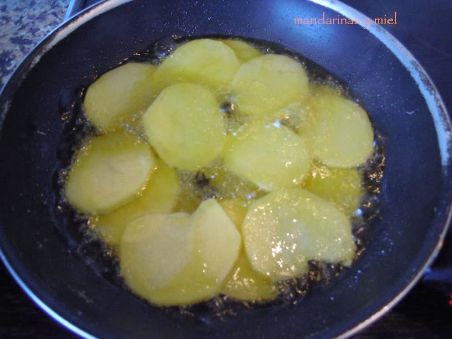 Las freímos en abundante aceite, en diferentes tandas para que no se peguen unas a otras, y las vamos sacando a un plato con papel absorbente y las dejamos escurrir. Las patatas han de quedar un poco blandas, nunca duras. Mantenerlas calientes hasta que estén los huevos hechos.