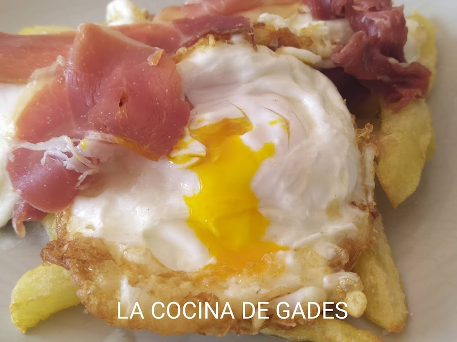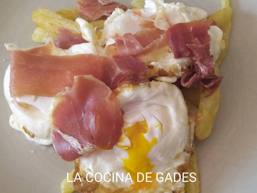 Enplatamos, ponemos las patatas encima los huevos y el jamón.