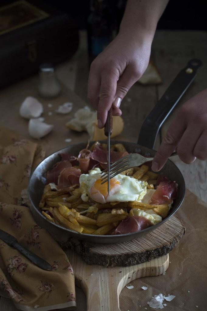 Para hacer esta receta, le hemos añadido el ingrediente más común que los suele acompañar; el jamón serrano. Pero además se puede usar chorizo, morcilla, o incluso con setas. Lo he presentado en la sartén de hierro mineral DE BUYER, que le dan un sabor muy especial a la comida ¡¡y me tienen enamorada!!. Nosotros las adquirimos en la web MI SARTÉN, dónde además de este modelo hay muchos más tamaños y materiales para escoger, y de precio están muy muy bien.
