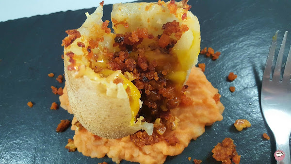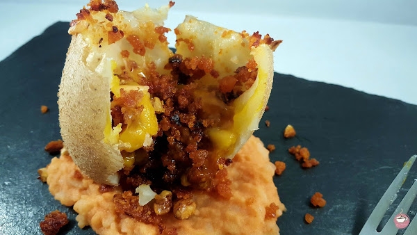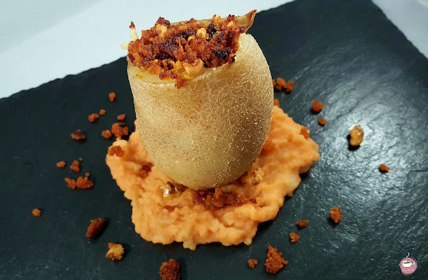 Para emplatar, formamos una cama con la crema de patata y pimentón y colocamos encima la patata rellena. Espolvoreamos con nueces picadas. Servir inmediatamente.